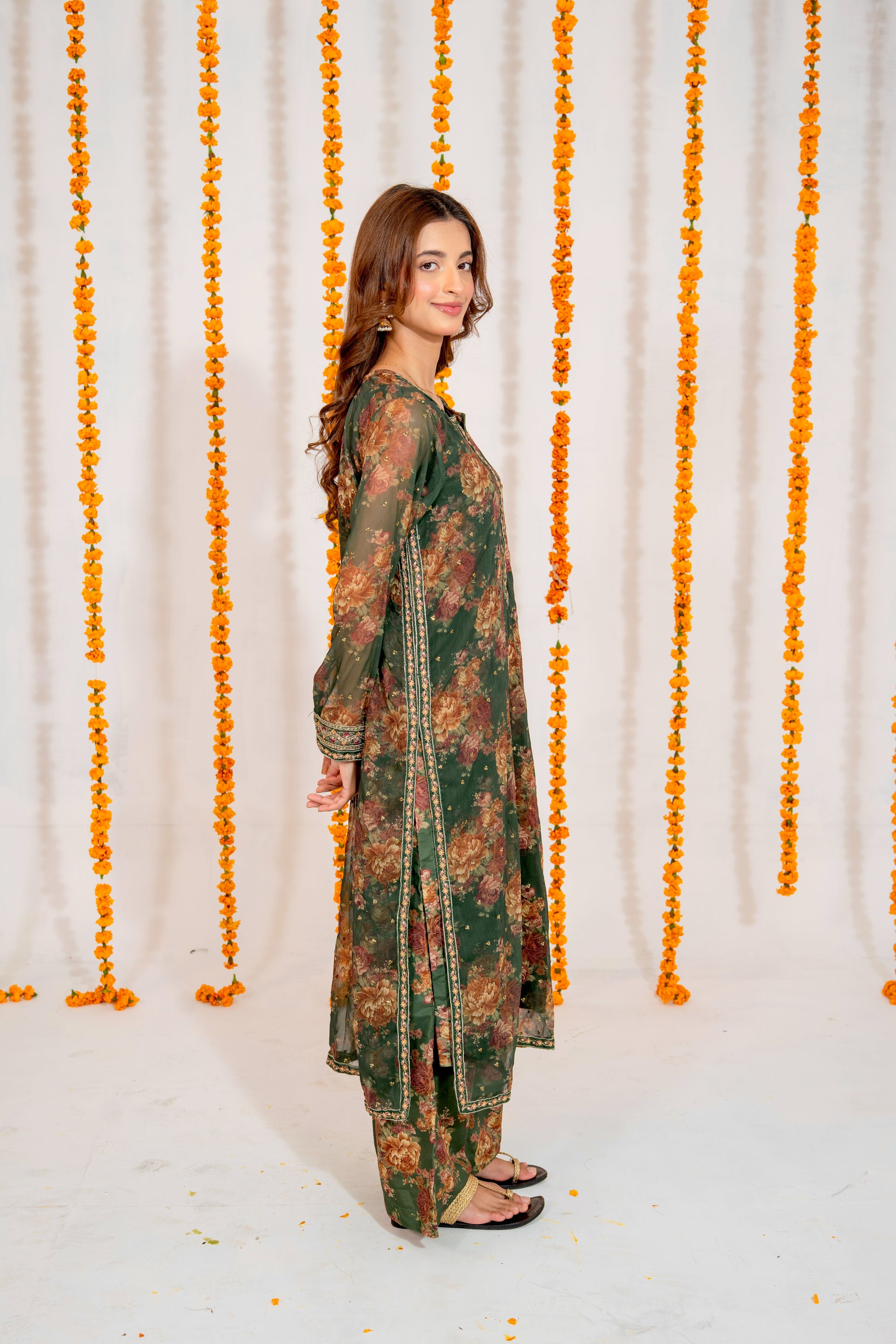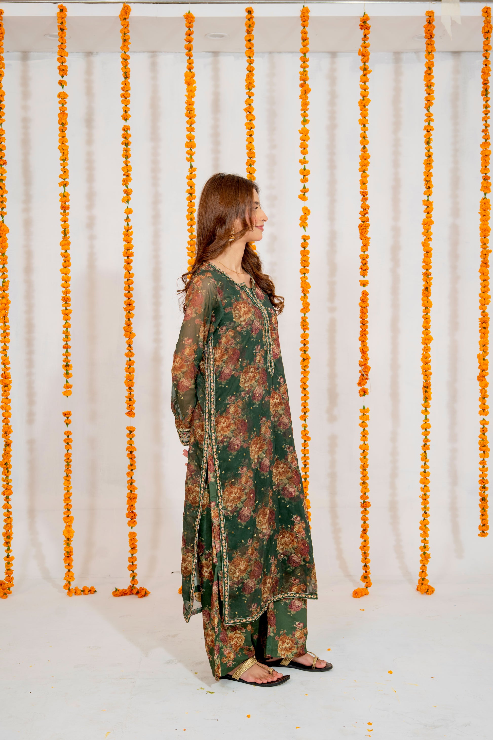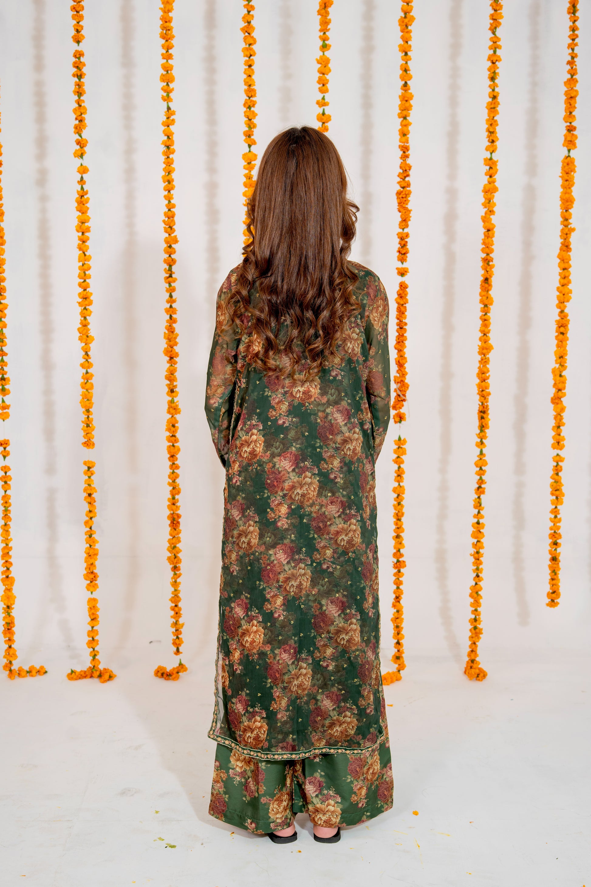 A straight, long Chiffon Emerald Green shirt adorned with delicate dull golden sitara and tilla embroidery on sleeves, side seams and neckline featuring intricate floral print detailing. It is paired with elegantly printed undershirt with printed culottes.