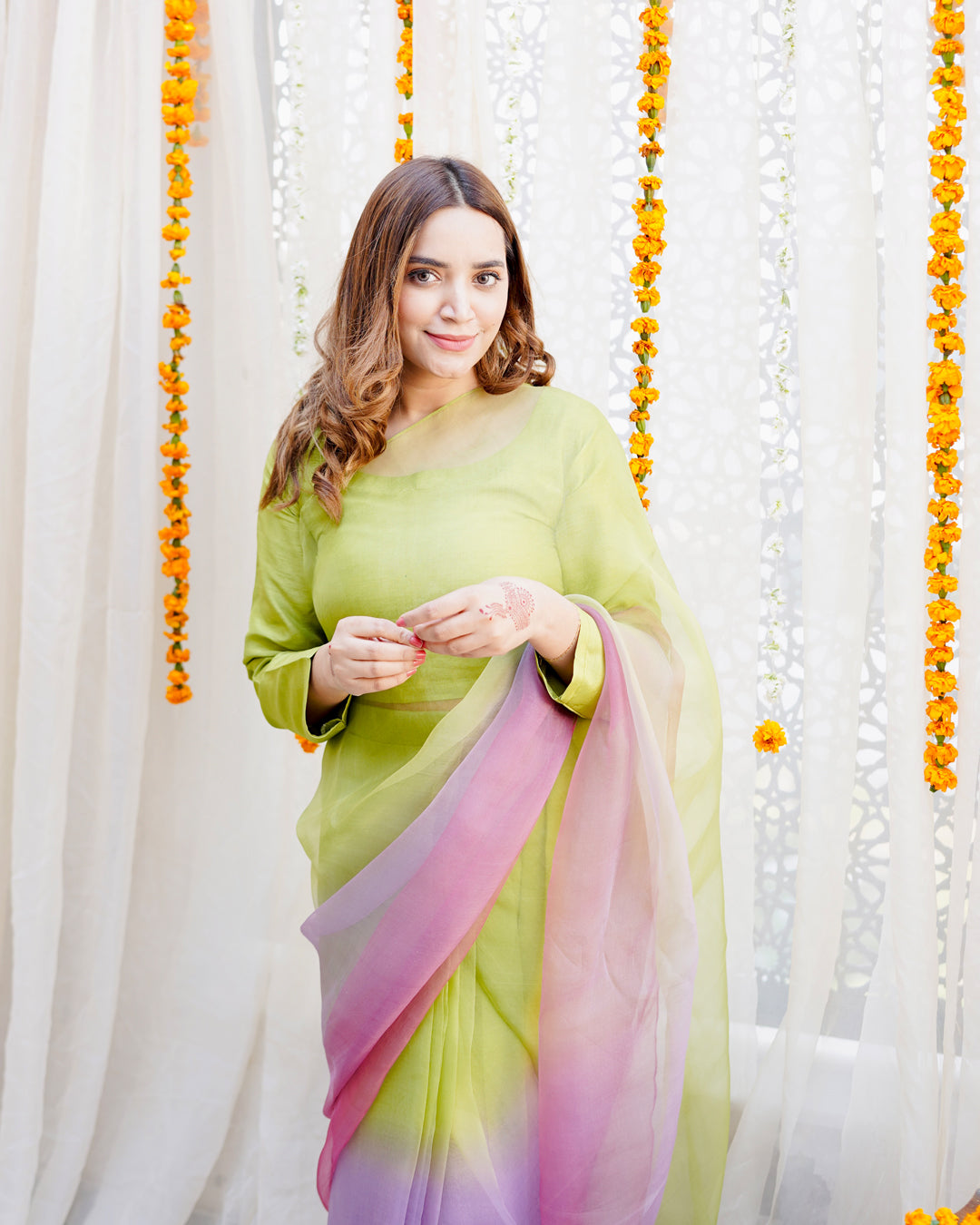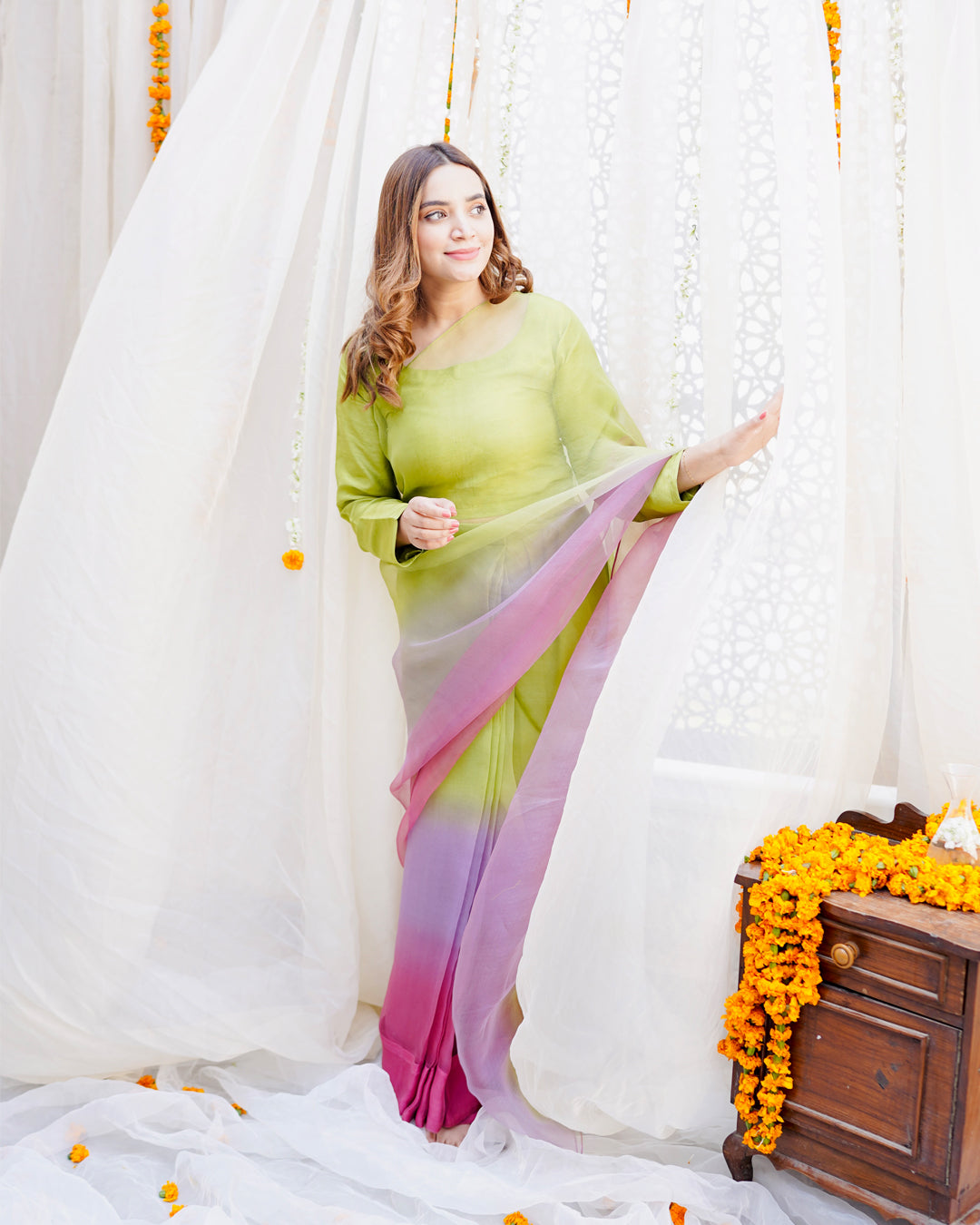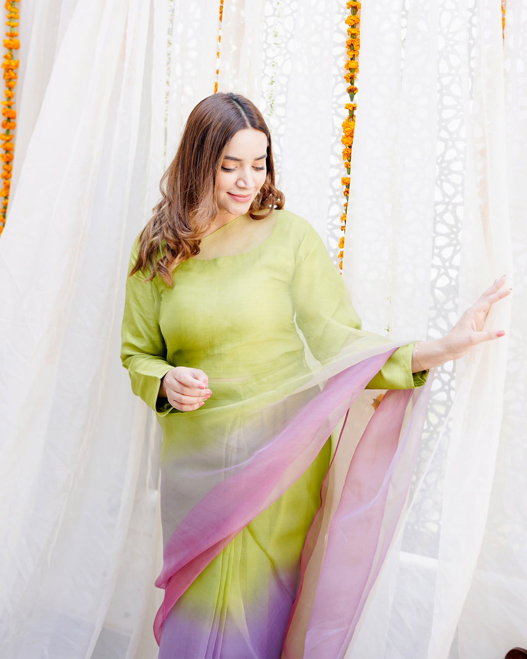 Lime green, lavender and pink hand dyed ombre saree pair with a long fitted sleeves blouse.