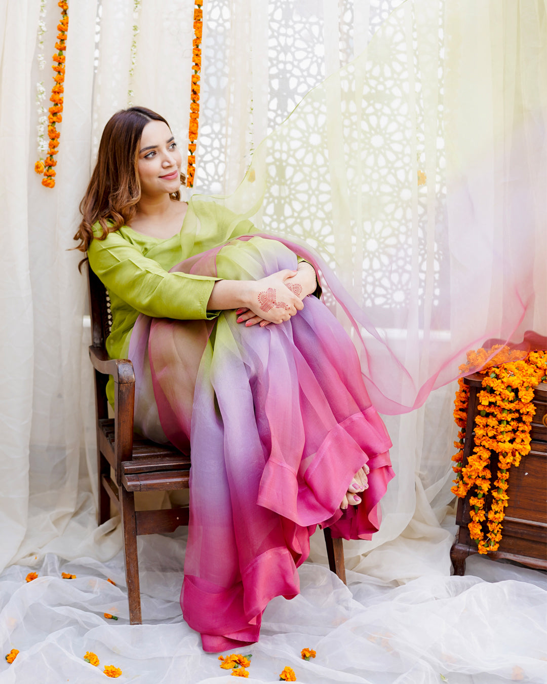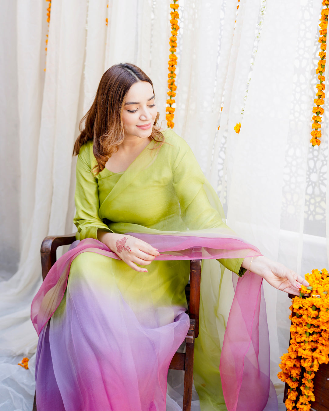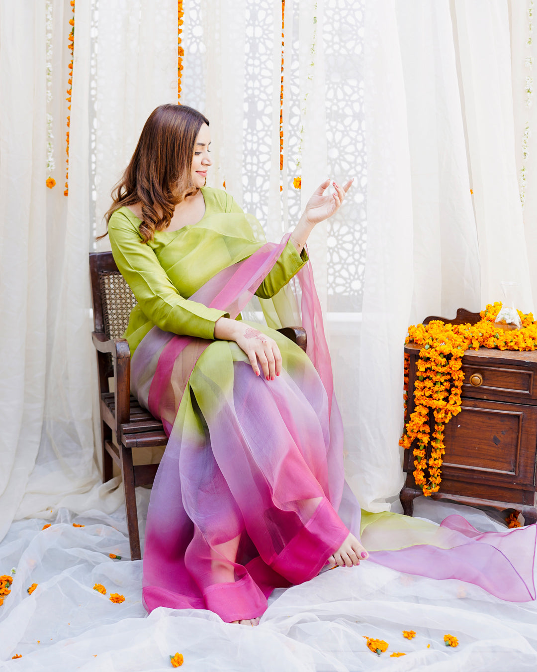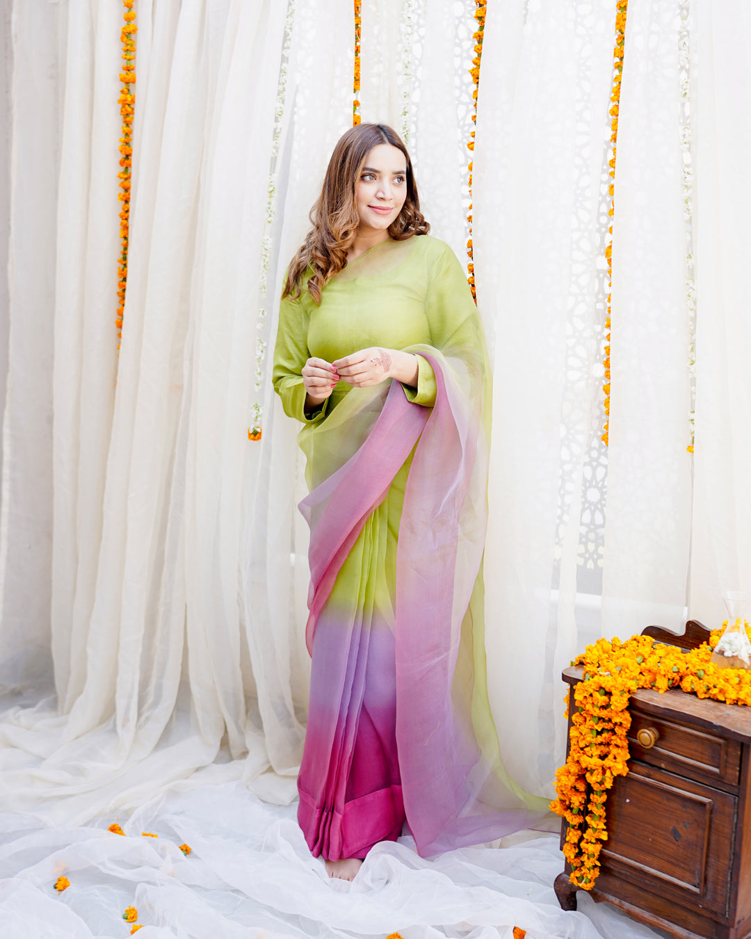 Lime green, lavender and pink hand dyed ombre saree pair with a long fitted sleeves blouse.