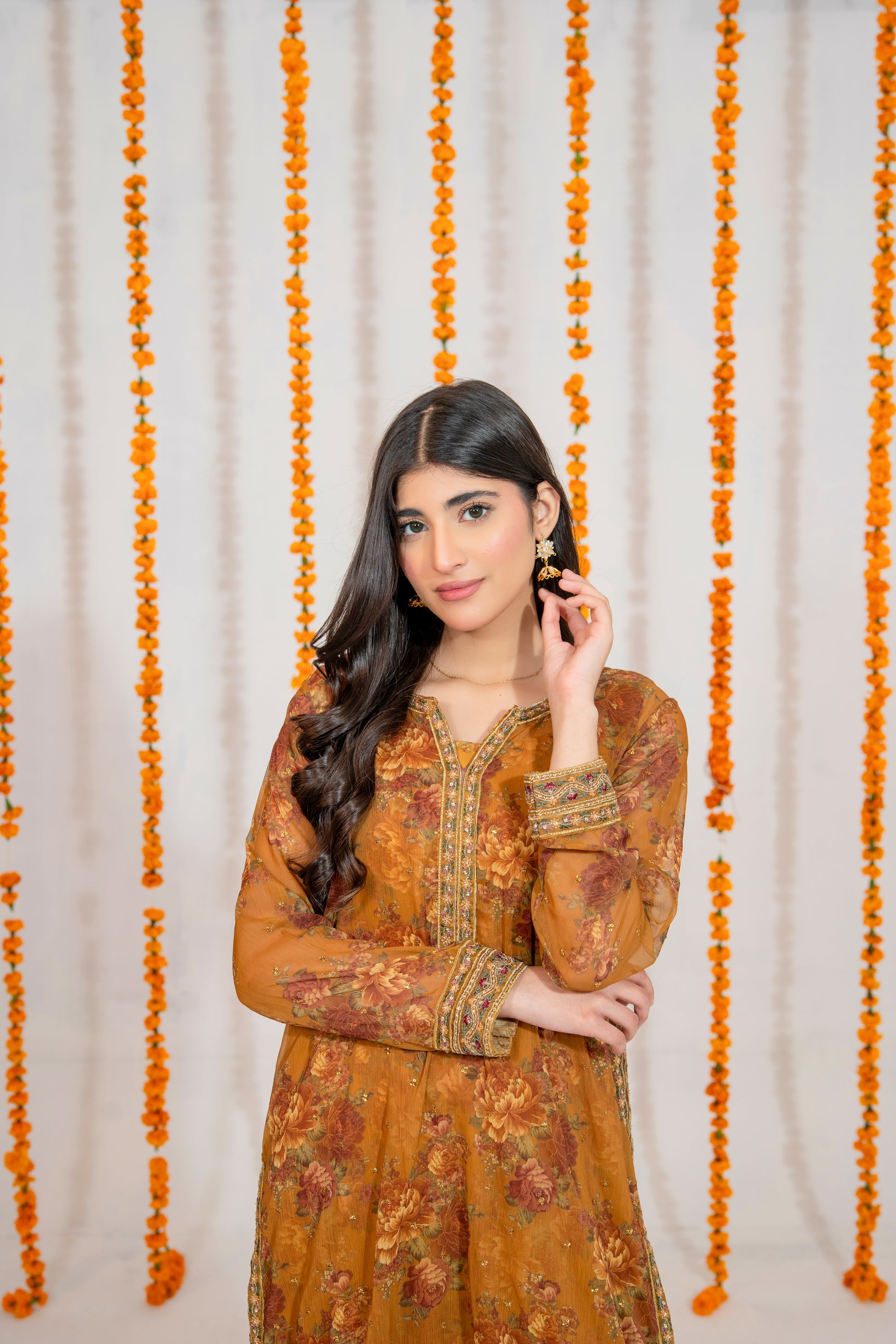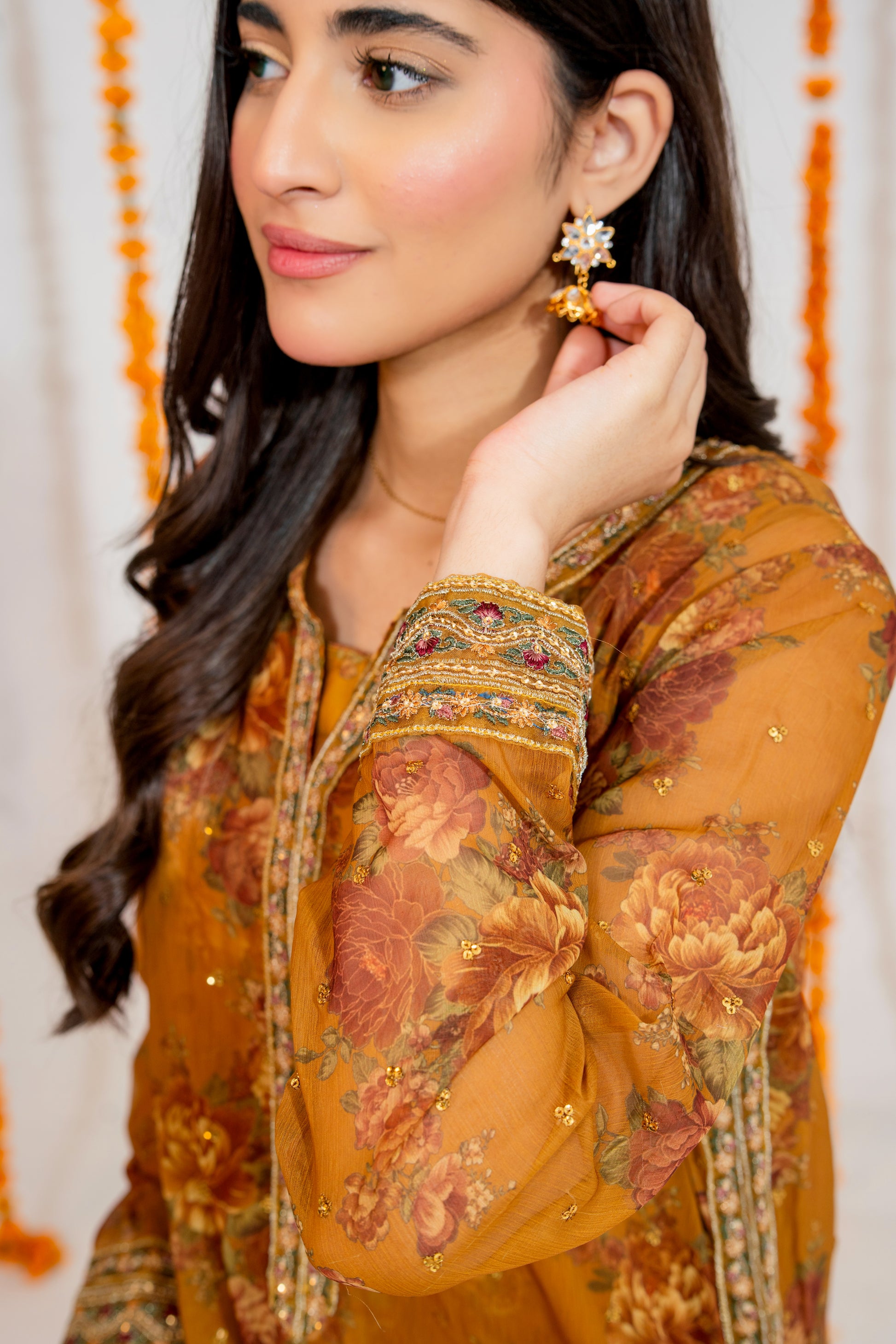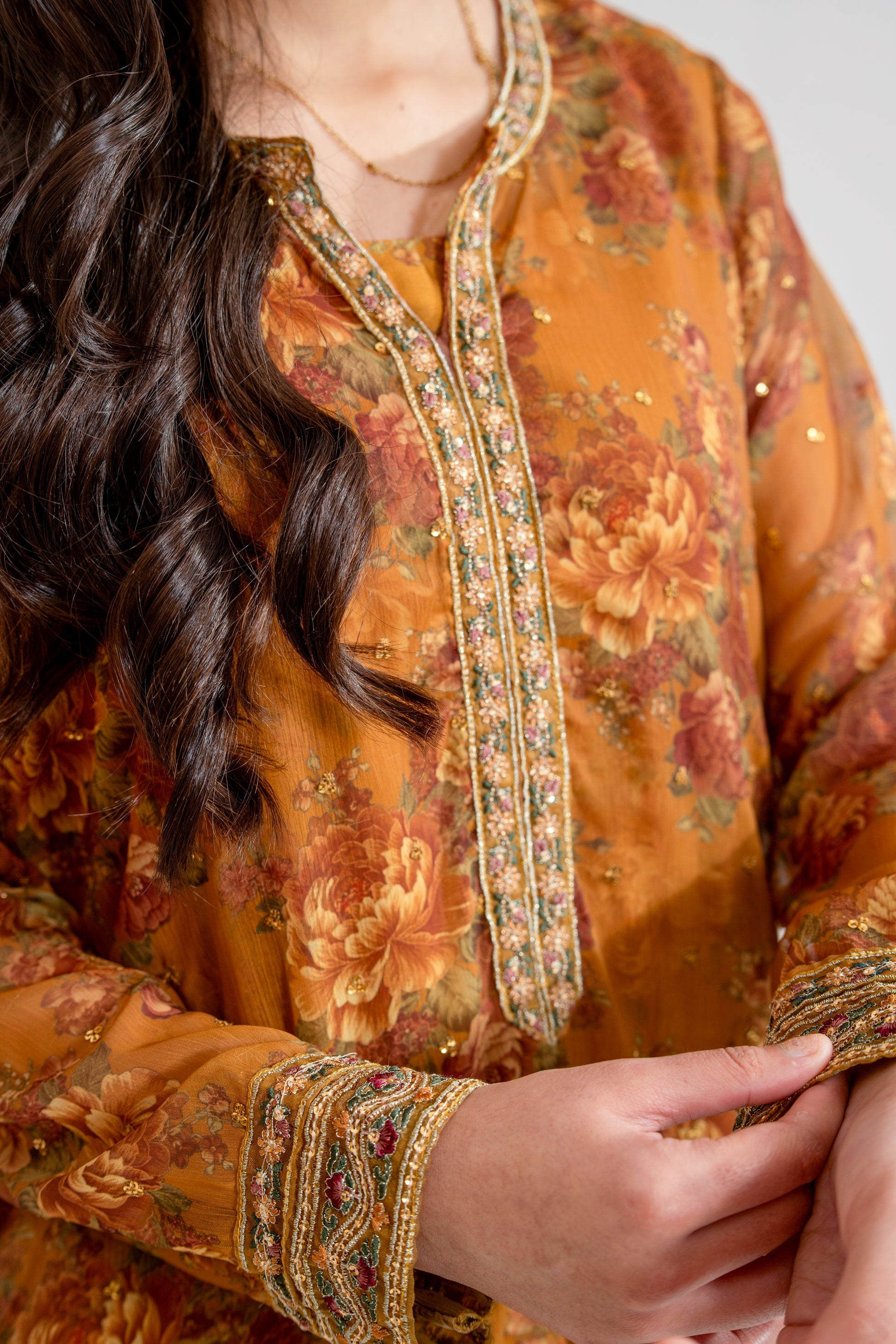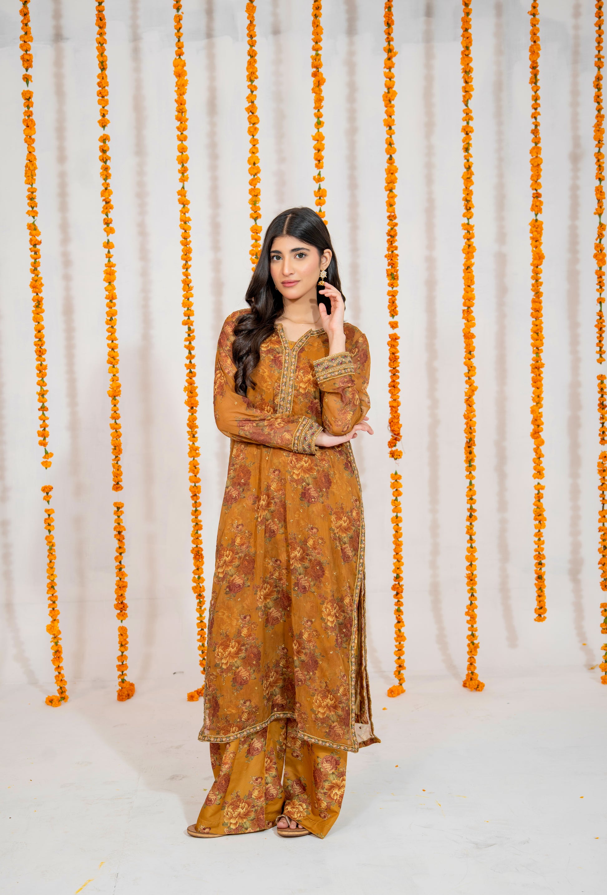 A straight, long Chiffon Mustard shirt adorned with delicate dull golden sitara and tilla embroidery on sleeves, side seams and neckline featuring intricate floral print detailing. It is paired with elegantly printed undershirt with printed culottes.