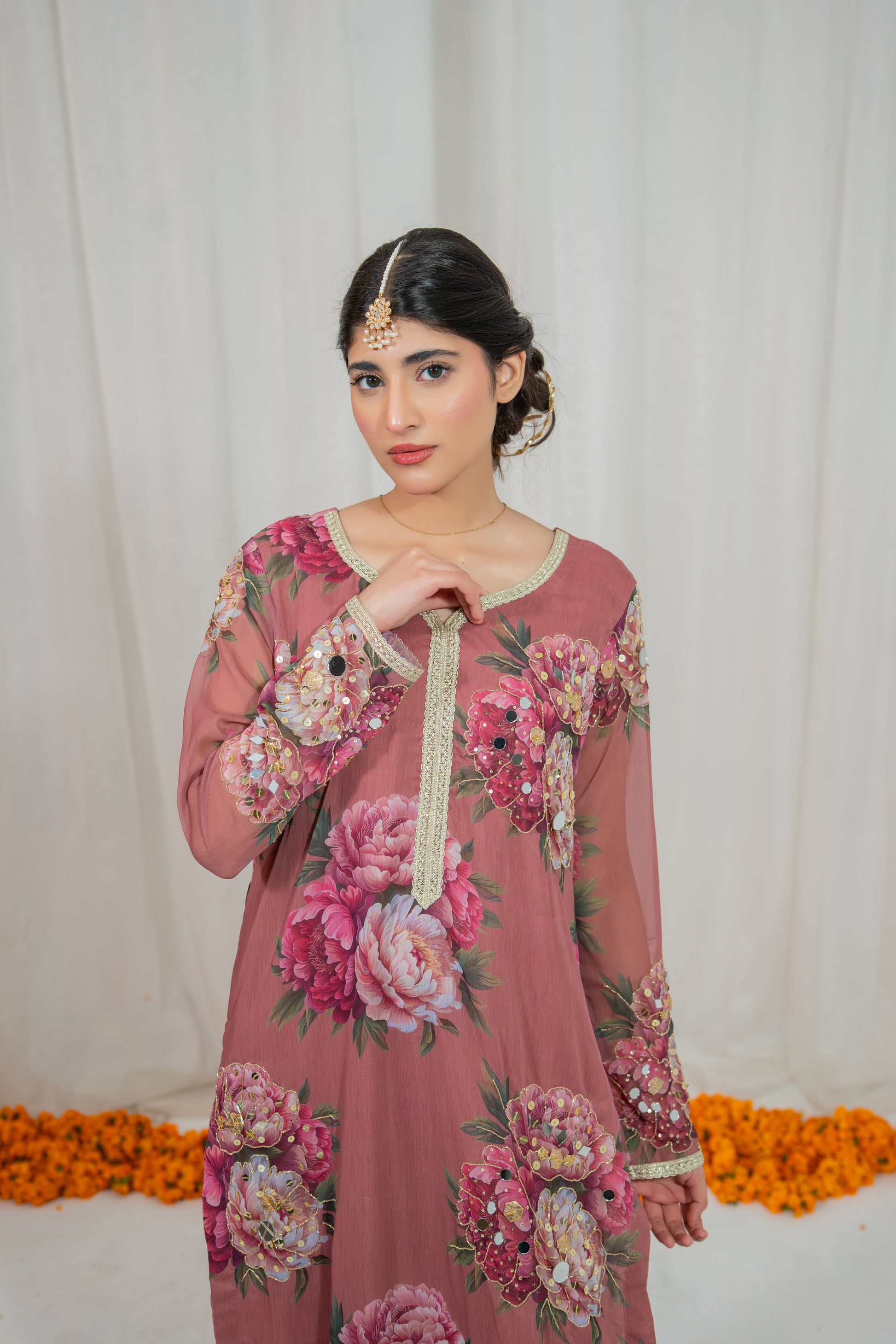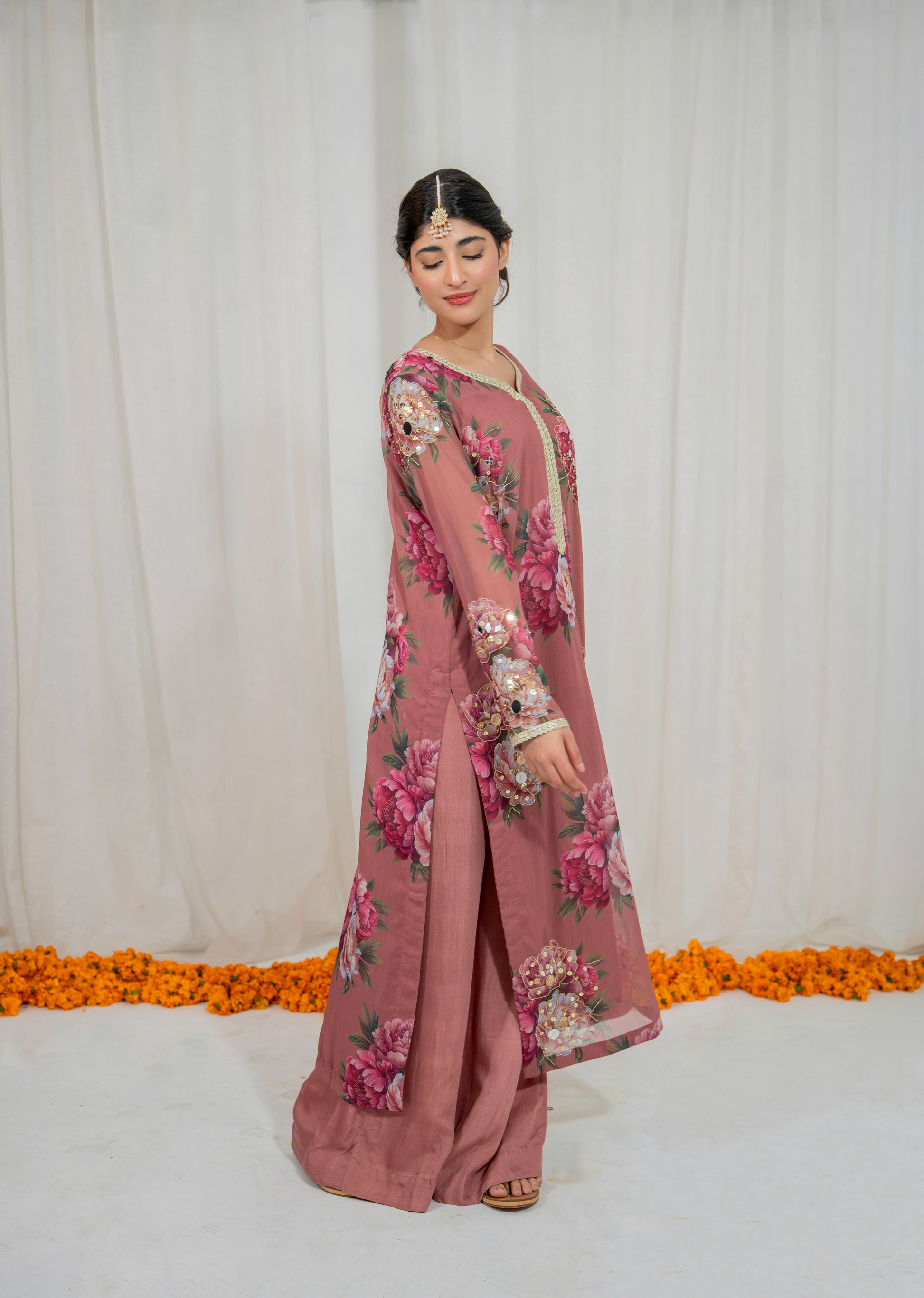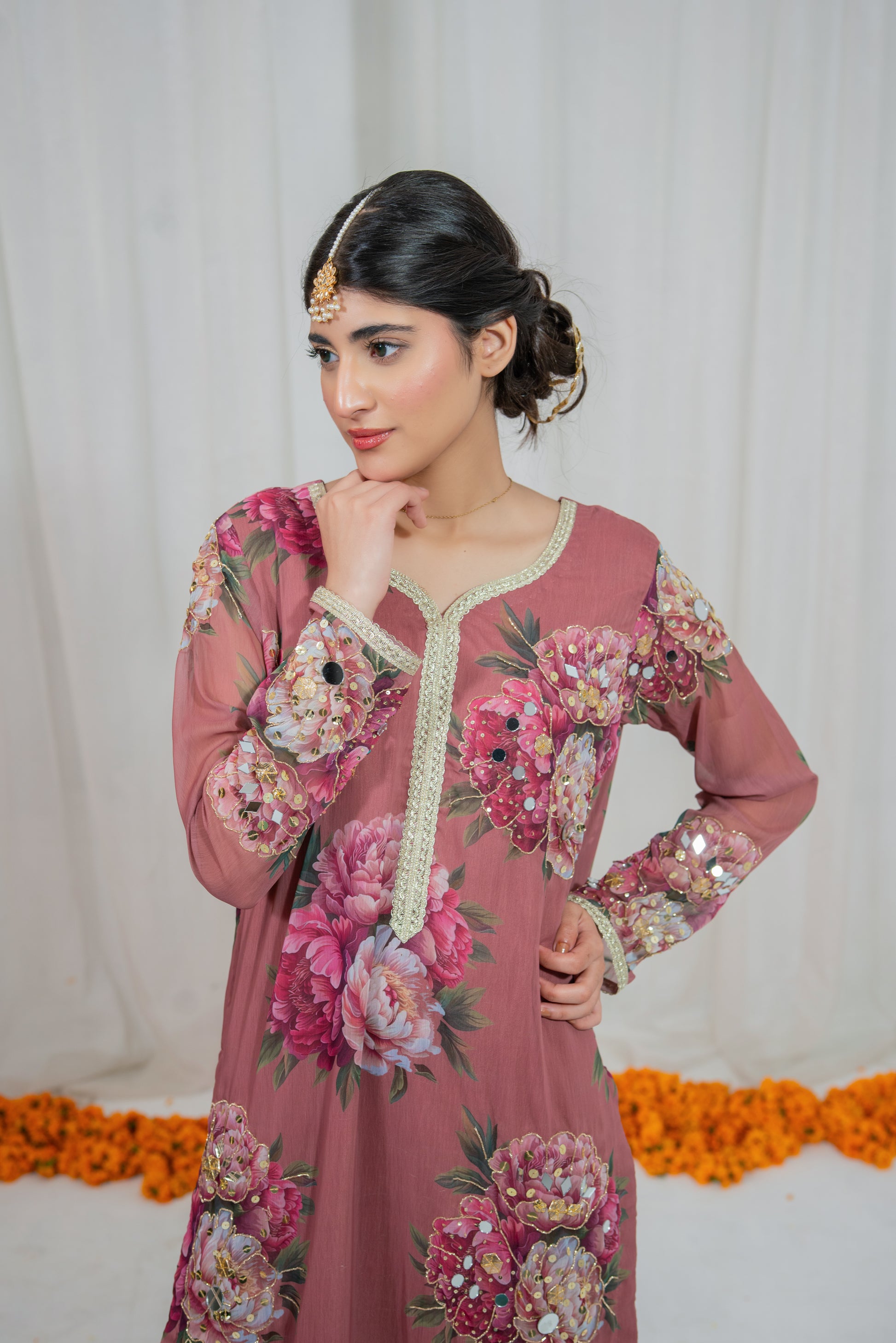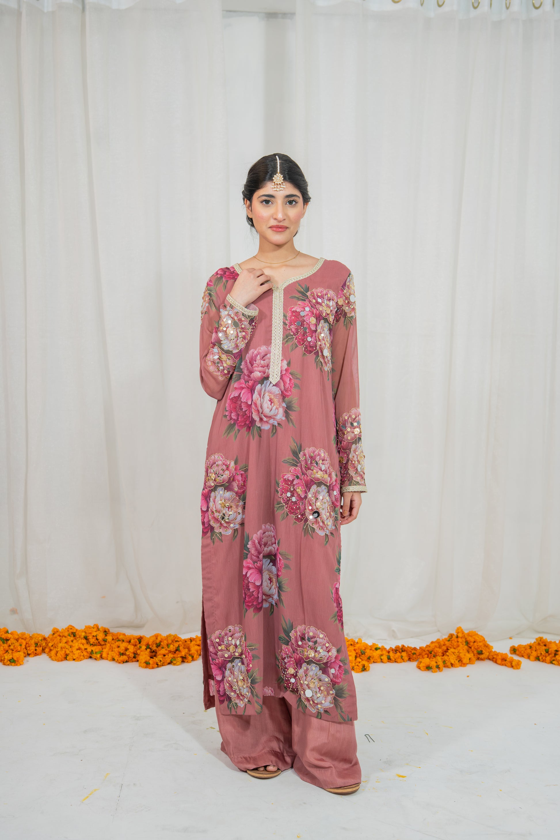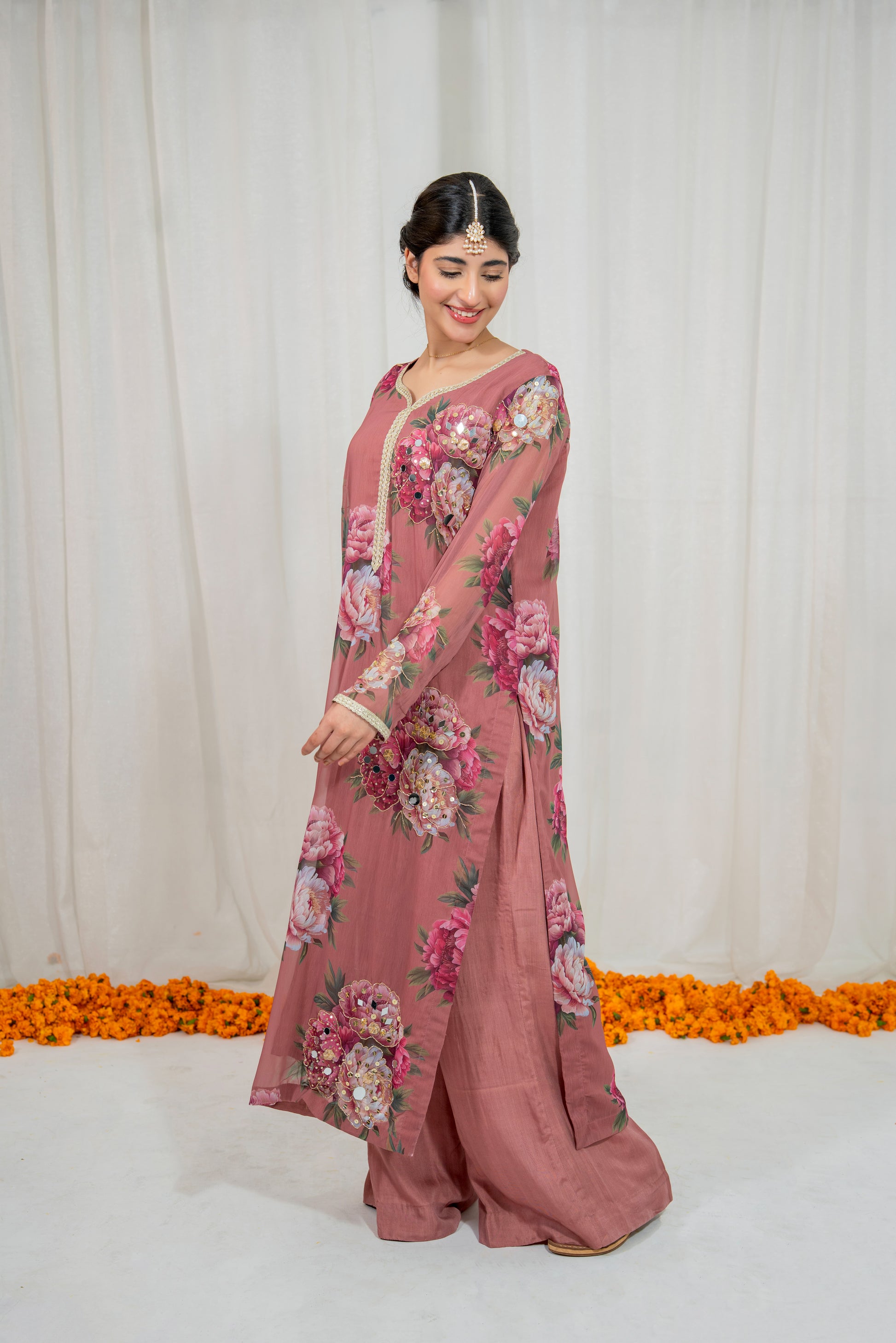 A straight, long floral printed chiffon Flamingo pink shirt adorned with delicate handwork of dull golden sitara, zari, mirror work and katdana details on shirt front and sleeves along with lace details on neckline and sleeves paired with culottes.
