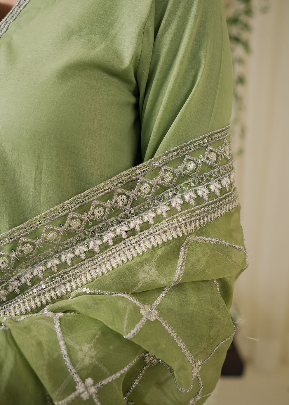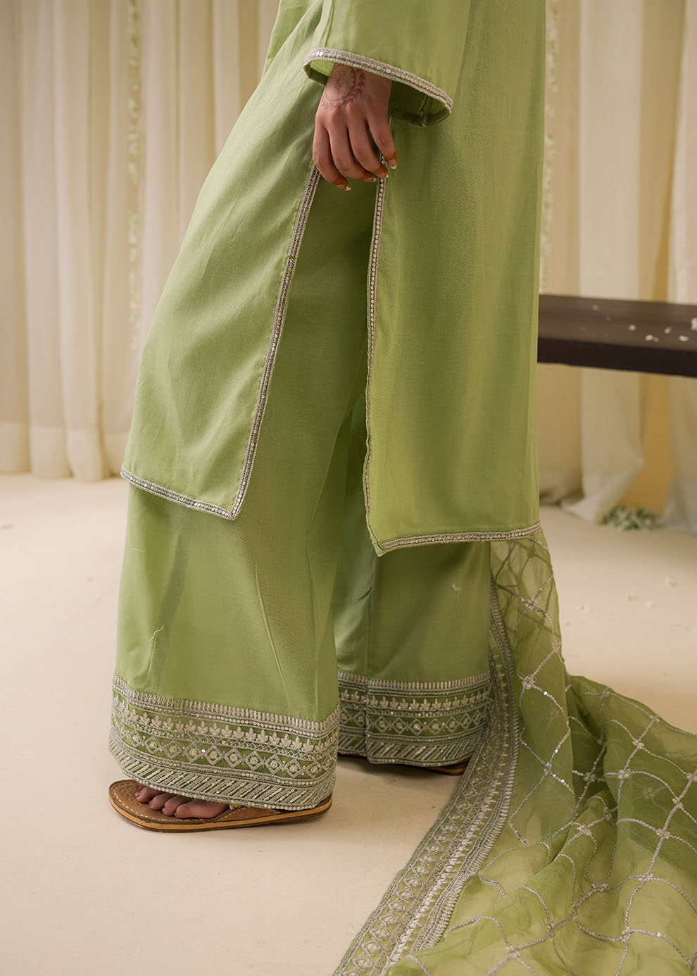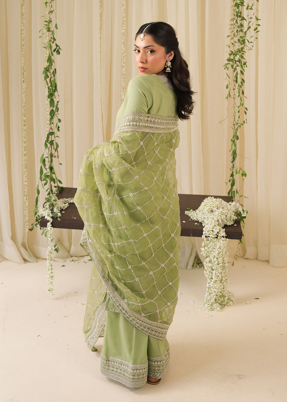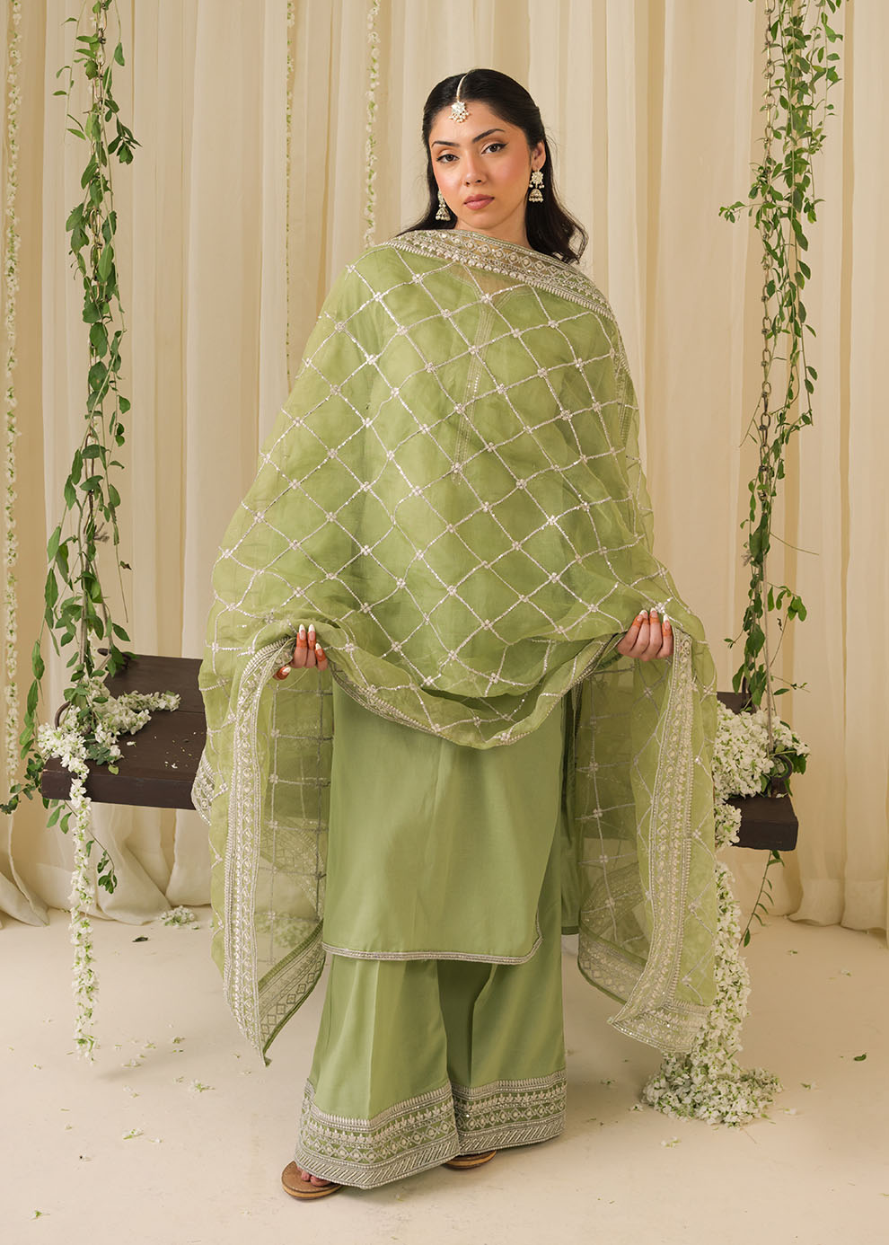 Unveil timeless beauty with Sohai - a perfect blend of pistachio green with delicate silver tilla and sitara embroidery. This ensemble features a stunning cotton lawn shirt, embroidered culottes, and a sheer organza dupatta that's nothing short of magical.
