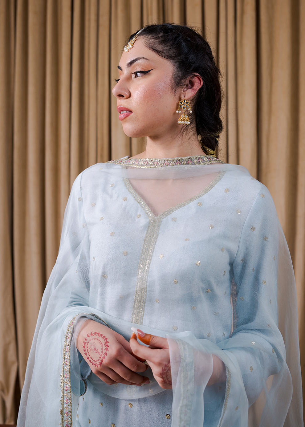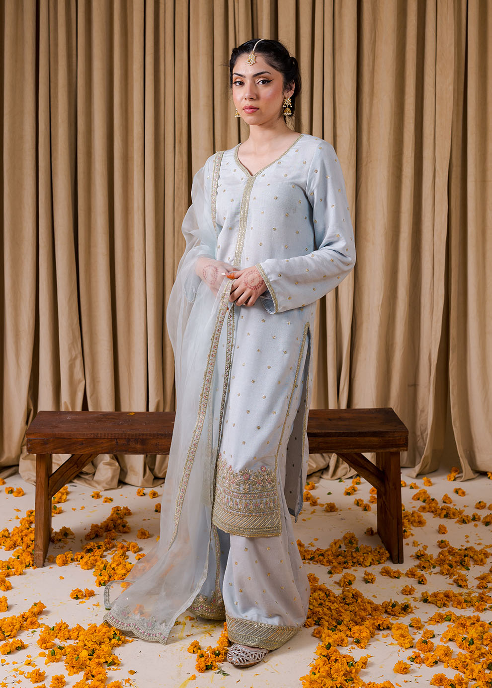 A long, straight powder blue shirt adorned with dull golden sitara and tilla embroidery, featuring intricate floral detailing. Paired with embroidered culottes and a sheer organza dupatta with scalloped edges for an elegant finish.