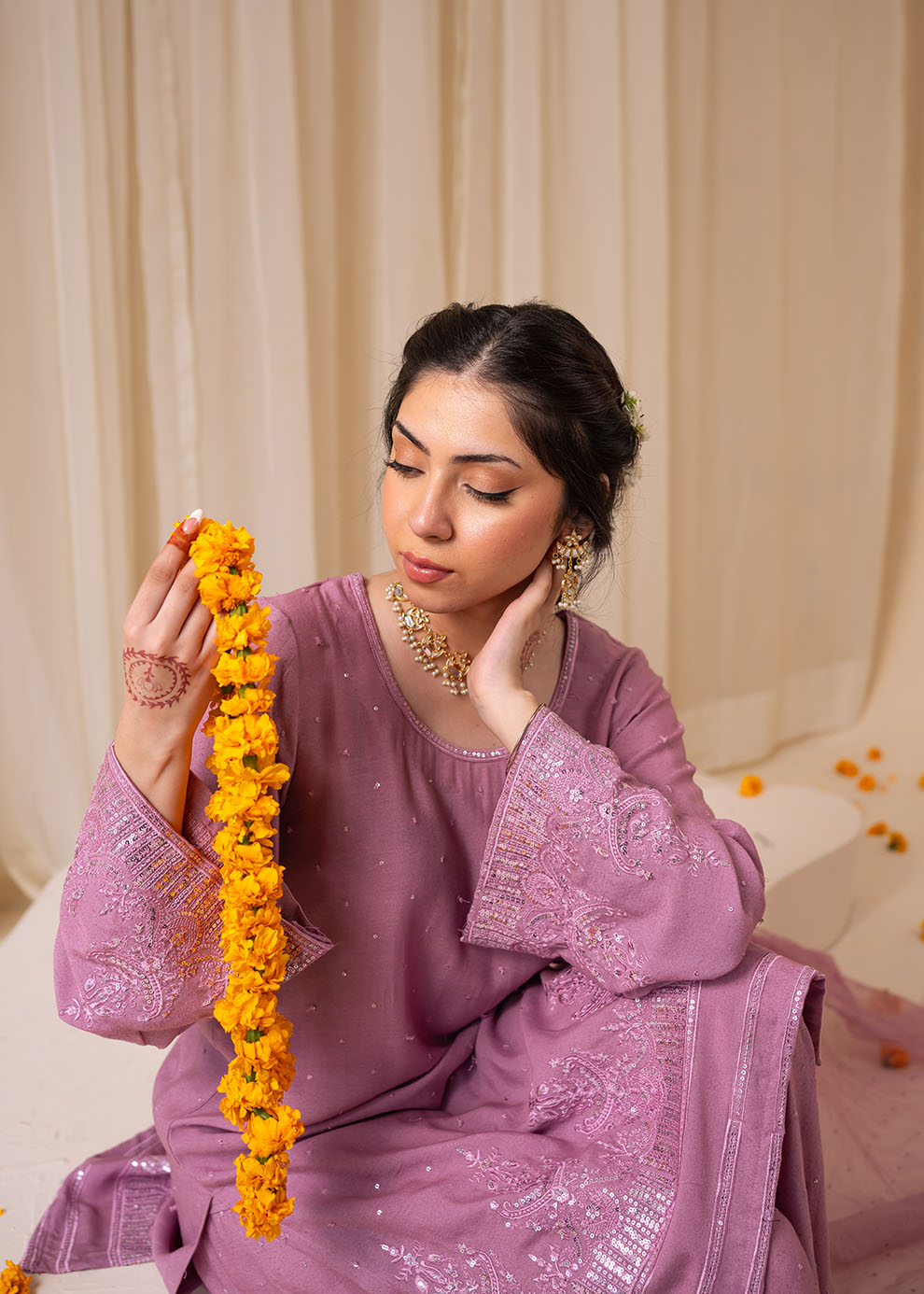 A timeless lavender ensemble with intricate silver embroidery, paired with a beautifully embroidered Farshi shalwar and a sheer organza dupatta for that perfect finishing touch. Crafted in soft cotton lawn for ultimate comfort.